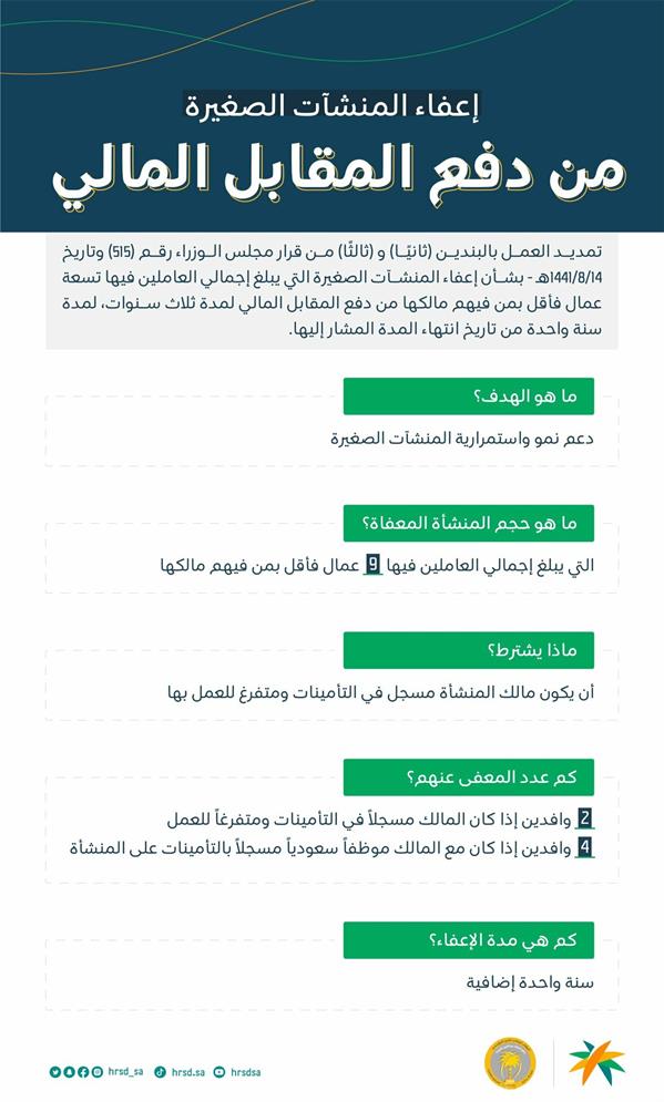 وكان مجلس الوزراء قد وافق على تمديد العمل بالبندين ثانيًا وثالثًا من قرار المجلس رقم 515 بتاريخ 14 / 8 /1441 هــ، بشأن إعفاء المنشآت الصغيرة التي يبلغ إجمالي العاملين فيها 9 عمال فأقل من دفع المقابل المالي لمدة 3 سنوات، لمدة سنة واحدة من تاريخ انتهاء المدة.