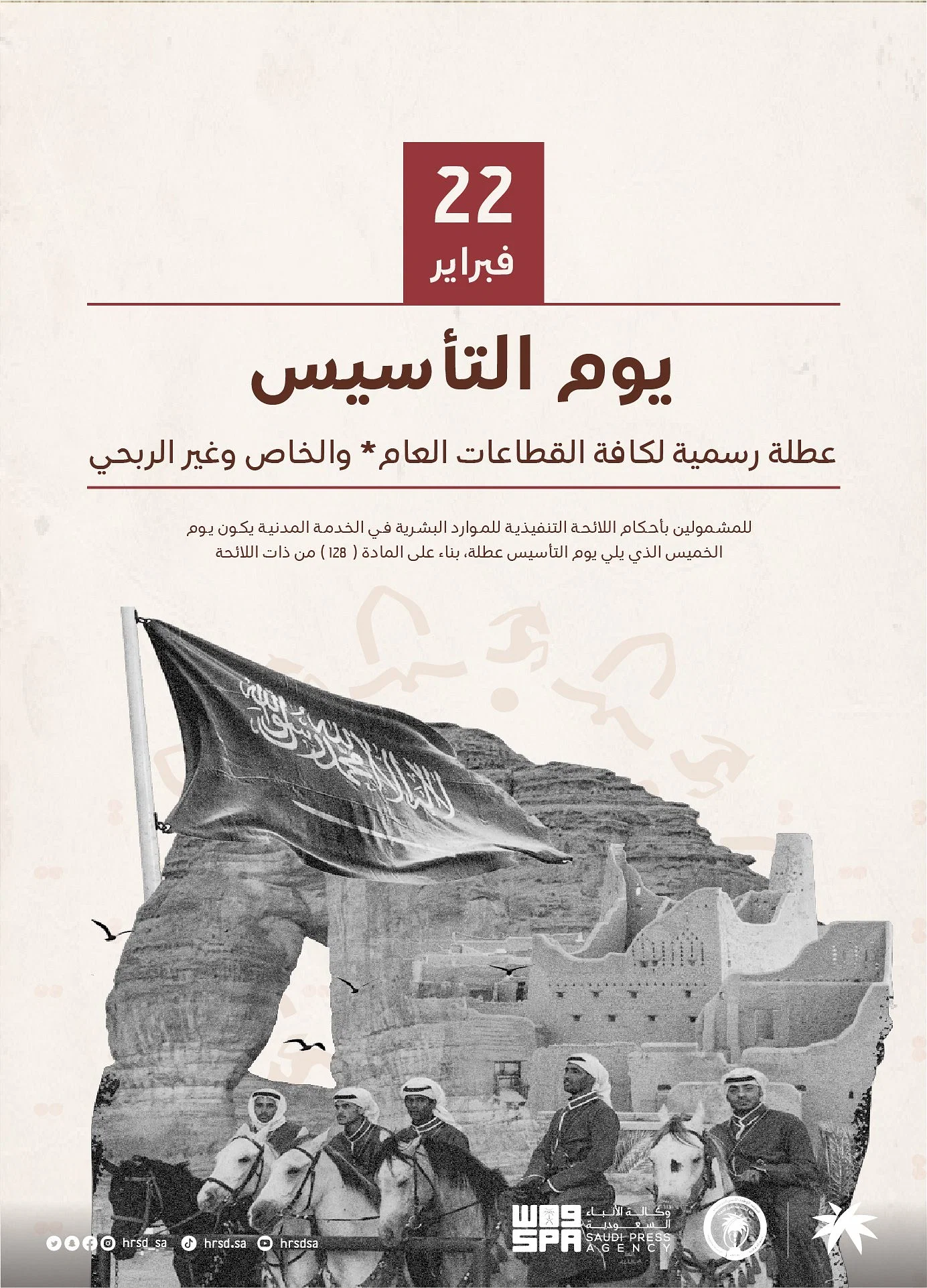 وأشارت إلى أن موظفي القطاع العام المشمولين بأحكام اللائحة التنفيذية للموارد البشرية في الخدمة المدنية سيكون يوم الخميس الذي يلي يوم التأسيس عطلة كذلك لهم، وفقًا للمادة الـ128 من اللائحة.