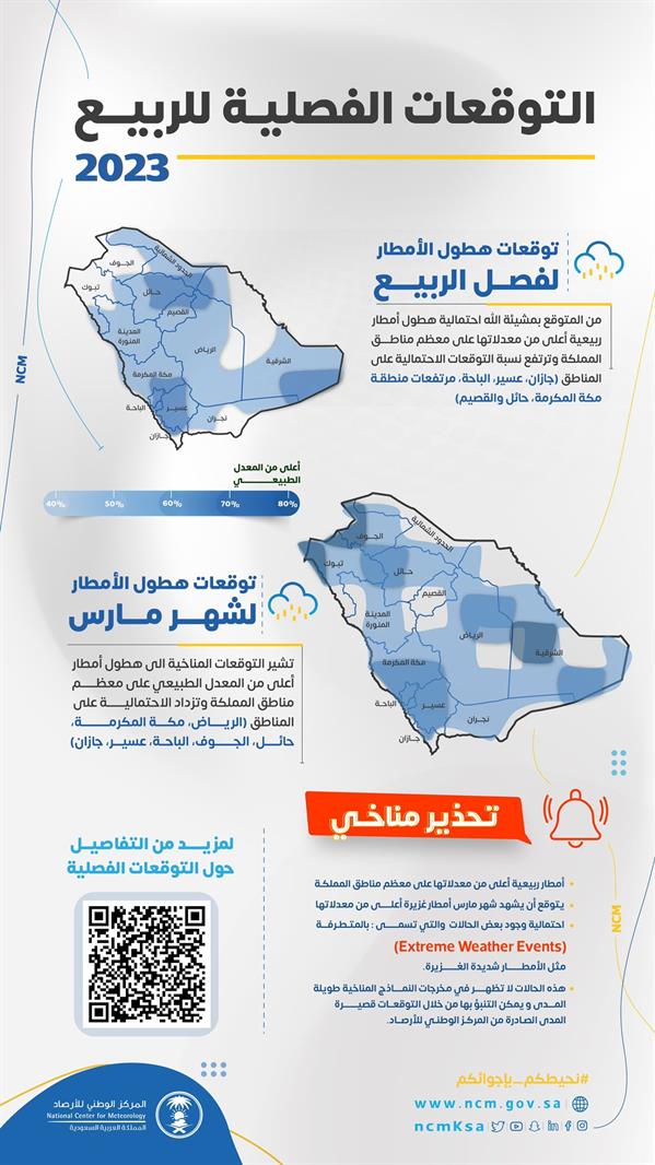 وتنبأ المركز بارتفاع درجات الحرارة عن معدلها الطبيعي خلال موسم الربيع على كافة مناطق المملكة حيث تصل إلى درجة واحدة على (الرياض، المدينة المنورة، الشرقية، حائل، القصيم، الجوف، تبوك، الحدود الشمالية، نجران)، بينما تزيد على معدلها الطبيعي بنصف درجة على مناطق: (مكة، الباحة، عسير).