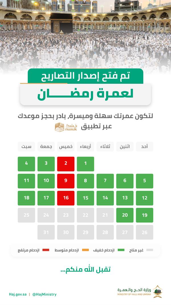 واستعرضت الوزارة، عبر حسابها على “تويتر”، خريطة زمنية لـ 20 يومًا من شهر رمضان، تُظهر مدى كثافة المعتمرين خلال الأيام المختلفة، وتوضح أن الحجز غير متاح للأيام العشر الأخيرة من الشهر.