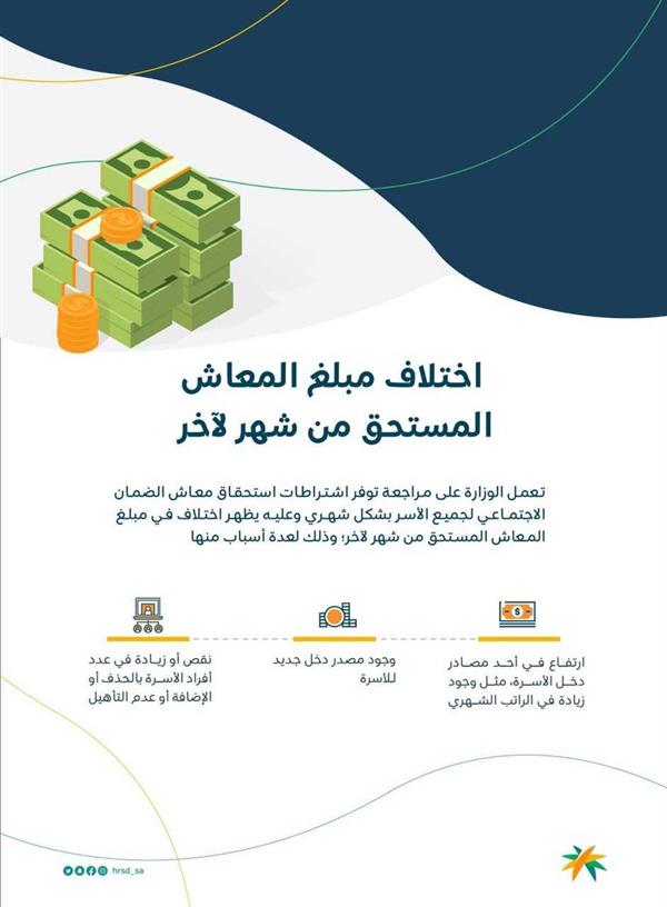 بيّنت وزارة الموارد البشرية والتنمية الاجتماعية الأسباب التي تؤدي إلى اختلاف مبلغ معاش التضامن الاجتماعي المُستحق من شهر لآخر، مشيرةً إلى أن المبلغ يُحتسب بعد مراجعة مجموع الدخل المسجل من قبل المستفيد والمطابقة مع البيانات الواردة من خلال الجهات المعنية.