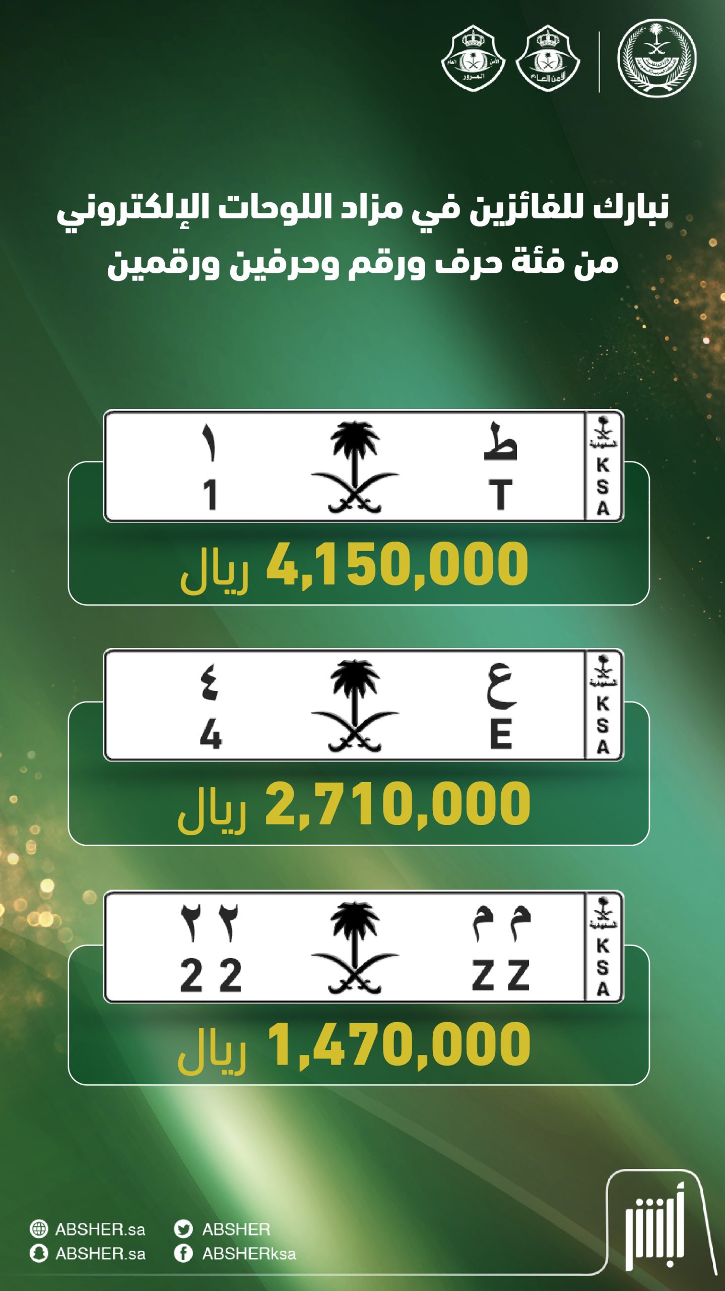 بيع لوحة سيارة بأكثر من 4 ملايين ريال في مزاد أبشربواسطة R / 14 مارس، 2023 حققت لوحة سيارة تحمل حرف ورقم “ط 1” أكثر من 4.1 مليون ريال، بعد طرحها في مزاد اللوحات الإلكتروني عبر منصة “أبشر”. ووصل سعر اللوحة “ع 4” إلر 2.7 مليون ريال، بينما اللوحة التي تحمل حرفين ورقمين “م م 22” تم بيعها بقيمة 1.470 مليون ريال. وكانت الإدارة العامة للمرور قد حددت قيمة اللوحة “ط 1” بمبلغ مليون ريال، قبل أن تشهد تنافساً كبيراً من قبل المشاركين في المزاد وتتجاوز الـ 4 ملايين. Post Views: 156