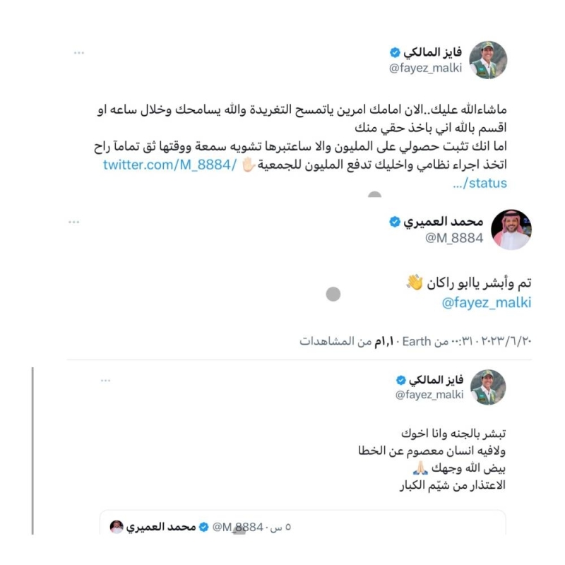 لكن المالكي شارك تغريدة العميري وهدده إن لم يحذفها وعلق: ما شاء الله عليك..الآن أمامك أمرين ياتمسح التغريدة والله يسامحك وخلال ساعة أو أقسم بالله إني باخذ حقي منك، إما إنك تثبت حصولي على المليون وإلا ساعتبرها تشويه سمعة ووقتها ثق تمامآ راح اتخذ إجراء نظامي واخليك تدفع المليون للجمعية”.