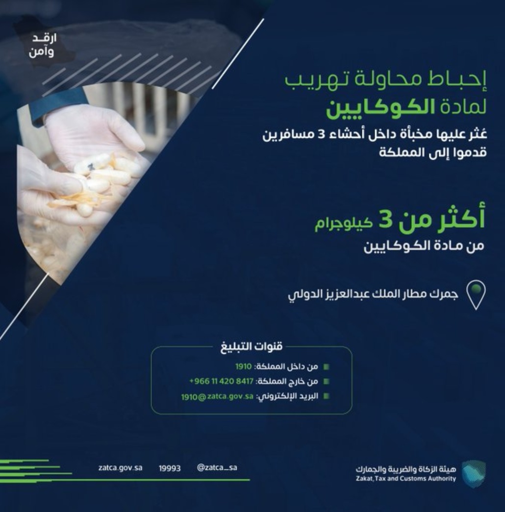 تمكنت هيئة الزكاة والضريبة والجمارك، في مطار الملك عبدالعزيز الدولي بجدة، من إحباط محاولة تهريب أكثر من 3 كجم من مادة “الكوكايين” المخدرة.