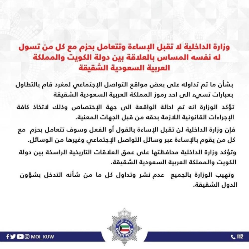 وأردفت: «تؤكد وزارة الداخلية محافظتها على عمق العلاقات التاريخية الراسخة بين دولة الكويت والمملكة العربية السعودية الشقيقة، وتهيب الوزارة بالجميع عدم نشر وتداول كل ما من شأنه التدخل بشؤون الدول الشقيقة».