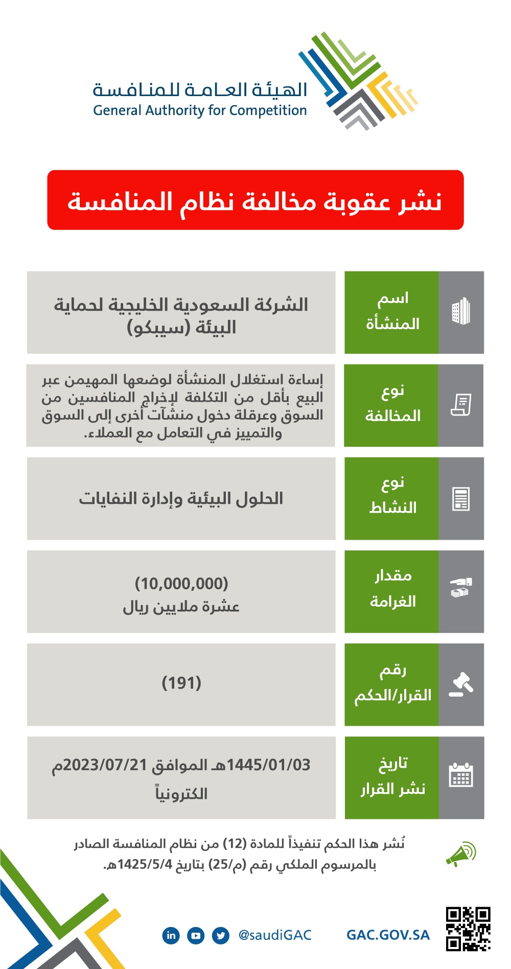 ثبتت مخالفة الشركة لنظام المنافسة وصدر قرار بمعاقبتها