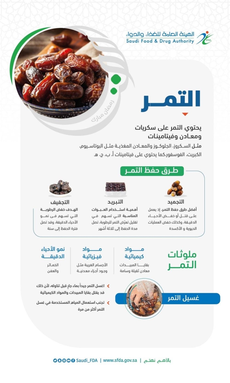 ونصحت الهيئة بضرورة غسل التمر جيداً بماء جارٍ قبل تناوله لأن ذلك قد يقلل بقايا المبيدات والمواد الكيميائية.