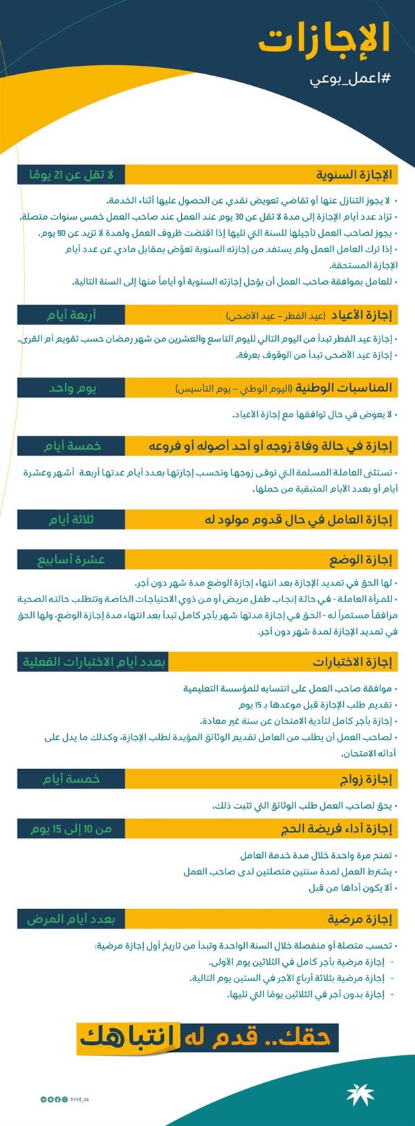 استعرضت وزارة الموارد البشرية والتنمية الاجتماعية الإجازات المستحقة للعاملين باختلاف أنواعها وأسبابها.