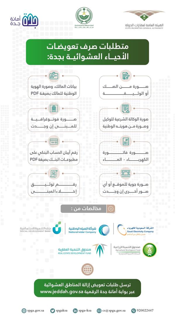 وأضافت أنه يمكن إرسال صورة فوتوغرافية للمبنى -إن وجدت- وصورة جوية للموقع أو أي صور أخرى -إن وجدت- ورقم توثيق إخلاء المبنى، وإرسالها من خلال خدمة استقبال طلبات تعويض إزالة المناطق العشوائية عبر بوابة أمانة جدة الرقمية.