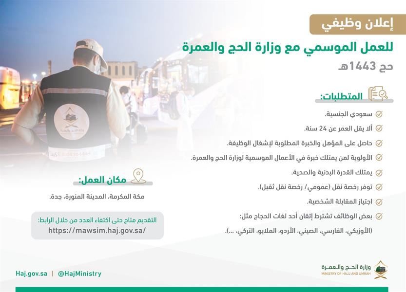 أعلنت وزارة الحج والعمرة، اليوم (الاثنين)، عن وظائف موسمية في موسم الحج 1443 هـ.