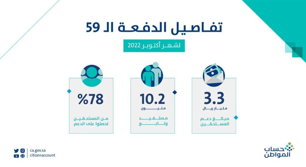 كشف برنامج حساب المواطن تفاصيل الدفعة الـ 59 الخاصة بالدعم المخصص لشهر أكتوبر الحالي للمستفيدين المكتملة طلباتهم والمستوفين لمعايير الاستحقاق.