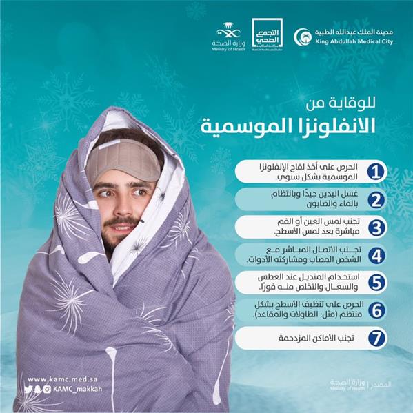 أوضحت مدينة الملك عبدالله الطبية، 7 طرق للوقاية من الإنفلونزا الموسمية مع اقتراب دخول فصل الشتاء، والتي كان في مقدمتها أخذ لقاح الإنفلونزا الموسمية بشكل سنوي.