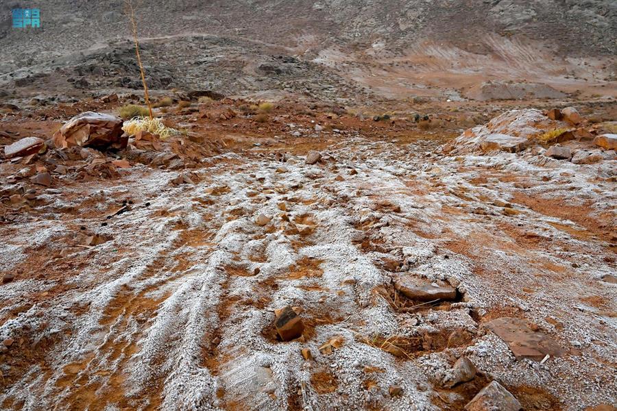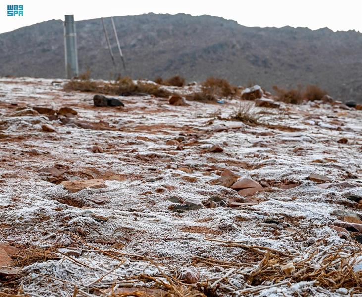 في مشهد يسر الناظرين، عانق الصقيع قمة جبل اللوز بمنطقة تبوك، إيذانا بارتداء الجبل حلته الشتوية البيضاء، مثلما يحدث في مثل هذا التوقيت من كل عام.