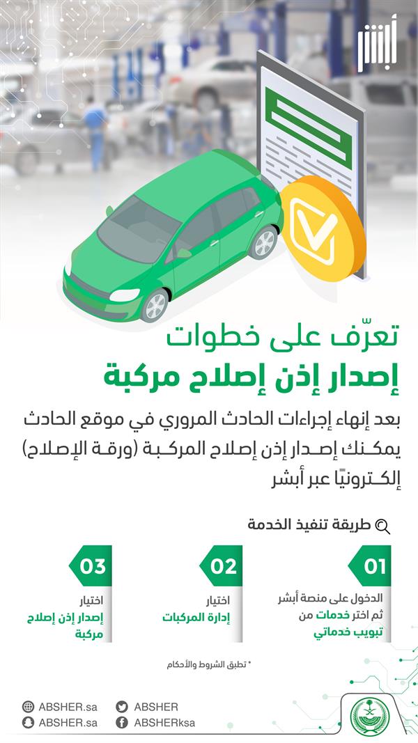 وقالت المنصة، إنه بعد إنهاء إجراءات الحـادث المروري في موقع الـحادث فيمكن إصدار إذن إصلاح المركبة إلكترونياً عبر أبشر، من خلال اتباع 3 خطوات.