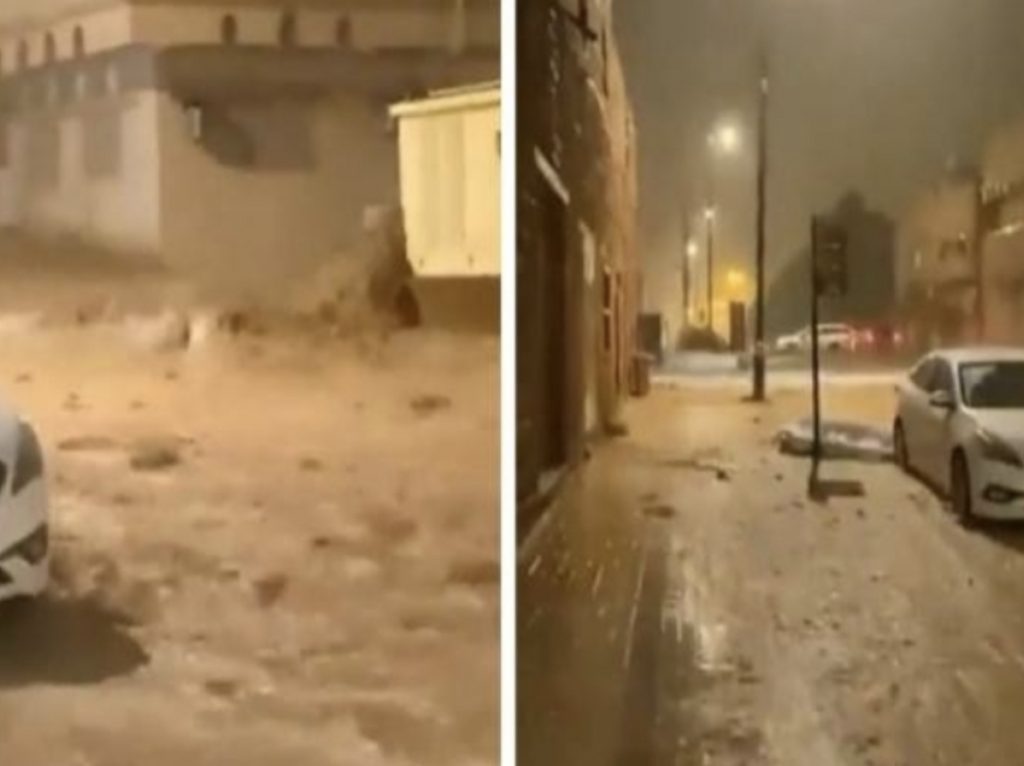 وثق مقطع فيديو، مياه السيول والأمطار الغزيرة تجتاح العلا فجر اليوم، مما تسببت في غرق الشوارع. ورصد الفيديو، السيول تحتجز