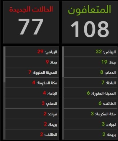 أعلنت وزارة الصحة اليوم الجمعة تسجيل 77 إصابة جديدة بفايروس كورونا المستجد المسبب لمرض «كوفيد-19»، فيما رصدت تعافي 108 حالات،