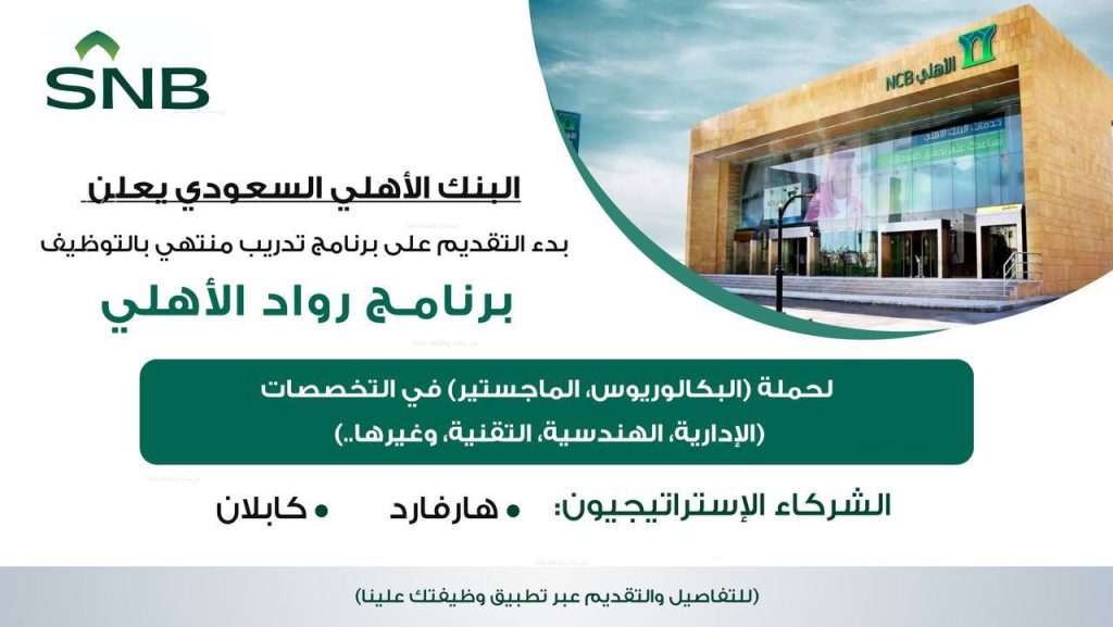 يعلن ( البنك الأهلي التجاري ) عن بدء التقديم على برنامج رواد الأهلي المنتهي بالتوظيف الدفعة الثالثة في ( الرياض