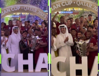 صحيفة المرصد: وثق مقطع فيديو التقاط أمير قطر الشيخ تميم بن حمد الصور التذكارية مع فريق المنتخب القطري بعد فوزه